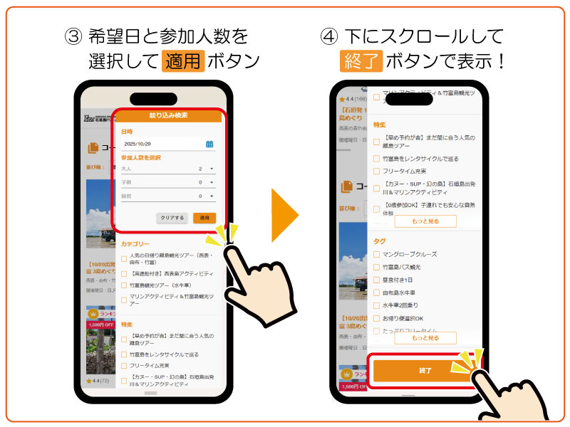 ② 「絞り込み検索」で希望日と参加人数を選択して適用ボタン
