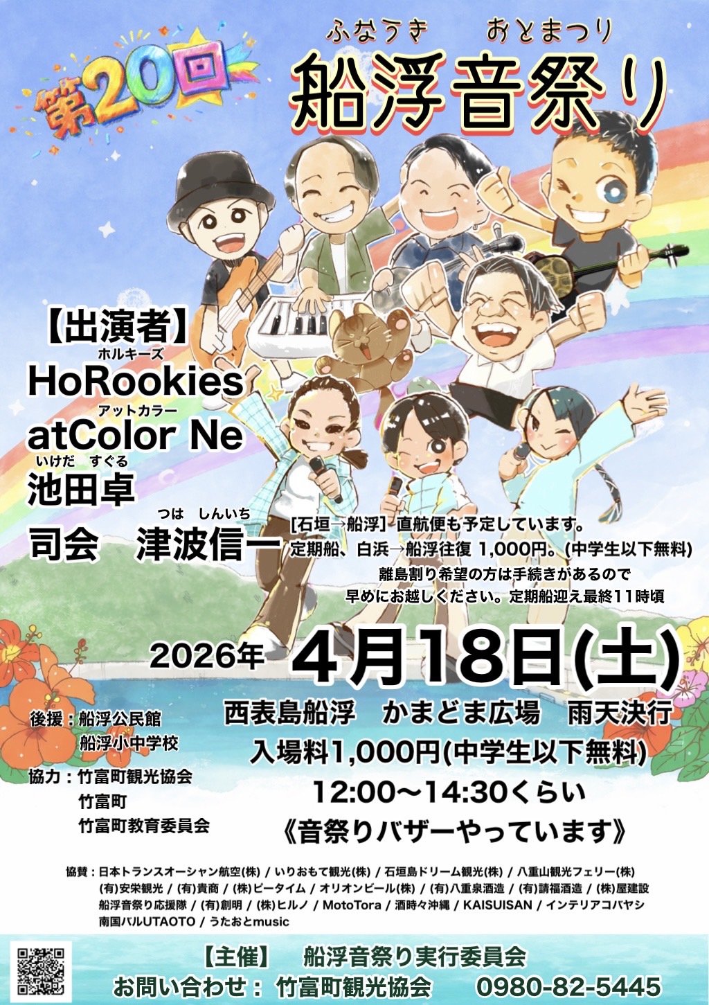 | 行程 | 【直行便で船浮へ】 乗船開始(09:30)~石垣港(10:00)~西表島船浮港(11:20)~第20回 船浮音祭り(12:00~14:30頃)~船浮港(15:30頃)~石垣港(16:50頃) 【海上の時化により、船浮への直行便が欠航の場合】 乗船開始(08:30)~石垣港(09:00)~西表島大原港(09:45)~白浜港(11:10頃)~船浮港~第20回船浮音祭り(12:00~14:30頃)~船浮港(15:00頃~)~白浜港~大原港~(17:15頃)~石垣港(18:00頃) 【運航ルートの決定について】 船浮への直行便、または大原港経由(バス移動等)のいずれになるかの運航判断は、ご出発の10日前〜1週間前を目安に行います。 決定次第、こちらのページにてご案内いたしますので、ご確認をお願い申し上げます。 *音祭り会場ではバザーが開催されております♪ 【2F席 プレミアムシート】お1人様2,000円(往復) 先着20名様限定で販売いたします! 見晴らしの良い2階席で、ゆったりとした優雅なひとときをお楽しみください。 ・予約方法 お申し込み時、備考欄に「プレミアムシート希望」とご入力ください。お電話でのご予約も承っております。 ・精算方法 ツアー当日、受付窓口でご精算をお願いいたします。 (現金 / クレジットカード / PayPayがご利用いただけます) ※定員に達し次第、受付を終了させていただきます。 ※片道利用でのご予約はお受けできません。 石垣島発着の往復乗船+入場券での販売となります。 ↓ 船浮音祭りの詳細はこちら ↓ ![]() |