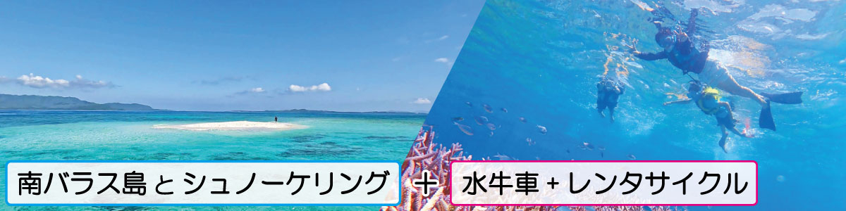 | 行程 | 特定ホテルお迎え、またはユーグレナ石垣港離島ターミナルに集合(07:45) 石垣港(08:15)~西表島大原港(09:00)~南バラス島上陸~シュノーケリング~大原港で昼食※①~大原港(13:25)~竹富港(14:05)~水牛車観光~レンタサイクルでフリータイム~竹富港~石垣港 *石垣島へのお戻りは下記の便より自由にお選びいただけます。 竹富港発 16:00、17:00(所要時間 約15分) *竹富島でレンタサイクルの最終返却時間は16:30です。 竹富港発17:00でご乗船の場合、レンタサイクルでのフリータイムは約80分です。 ※①ガイド特製の「八重山そば」をご用意します。 【南バラス島上陸とシュノーケリング/所要時間 約2時間30分】 シュノーケル船に乗り込んで、海の真ん中に現れる「奇跡の島・南バラス島」へ! 潮が引いた時だけ姿を現す、真っ白な砂の島に上陸。 360度エメラルドブルーに囲まれる幻想的な景色の中で、最高の記念写真を。 上陸後は透明度抜群のポイントへ移動してシュノーケリング! 丁寧なレクチャー付きで、色鮮やかなサンゴと魚たちが待つ水中世界へご案内します。 ※潮の満ち引きによって、南バラス島の大きさは変わります。 潮位の状況によっては、海面ギリギリでの上陸になる場合がございます。 |